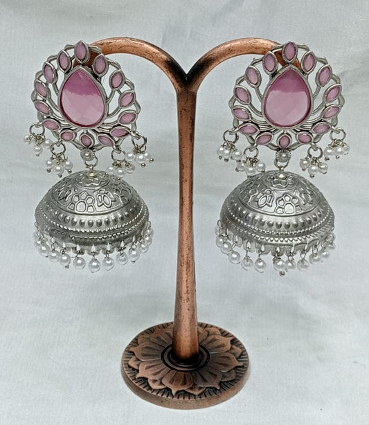 Antique Oxidized Silver Jhumka Earrings with Stone and Pearl Beads – Traditional Indian Dangle Earrings for Women